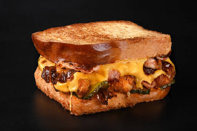 Хрумкі курячі стріпси, сир Чедер, чипса з бекону, гірчичний огірок, цибулевий конфітюр, соус Сирний, соус Спайсі, вершкое масло, хліб бріош. Хрумкі картопляні діпи з беконом, цибулевими кріспами та зеленою цибулею. Подаються під соусом Чедер.