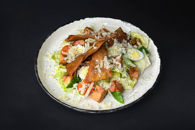 "Курка, обсмажена зі спеціями, салат айсберг, томати чері, свіжий огірок, перепелині яйця, хрумка піта та пармезан під соусом Ранч.