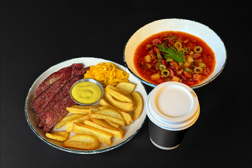 Комбо Пастрамі з яловичини та картопляні діпи, Солянка й напій
