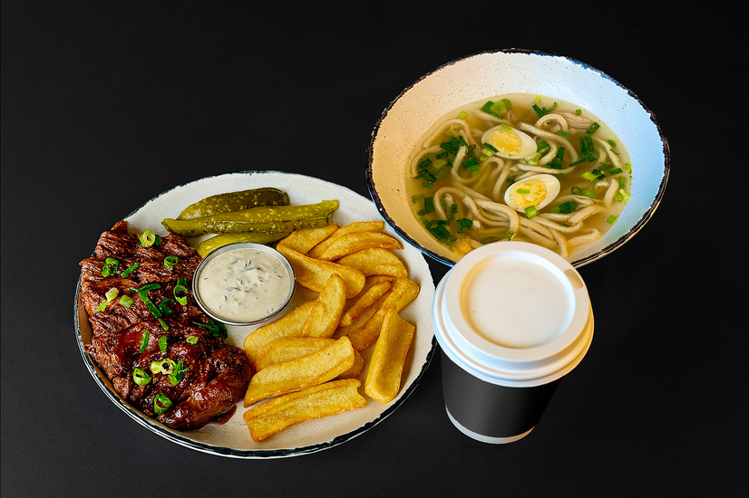 Meat Bar Черкаси Комбо Томлена шия та картопляні діпи, Курячий бульйон з локшиною й напій
