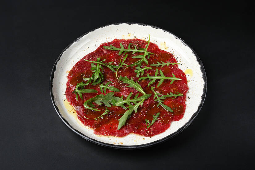 Карпачо з витриманої яловичини, сіль, перець, соус Карпачо, оливкова олія.