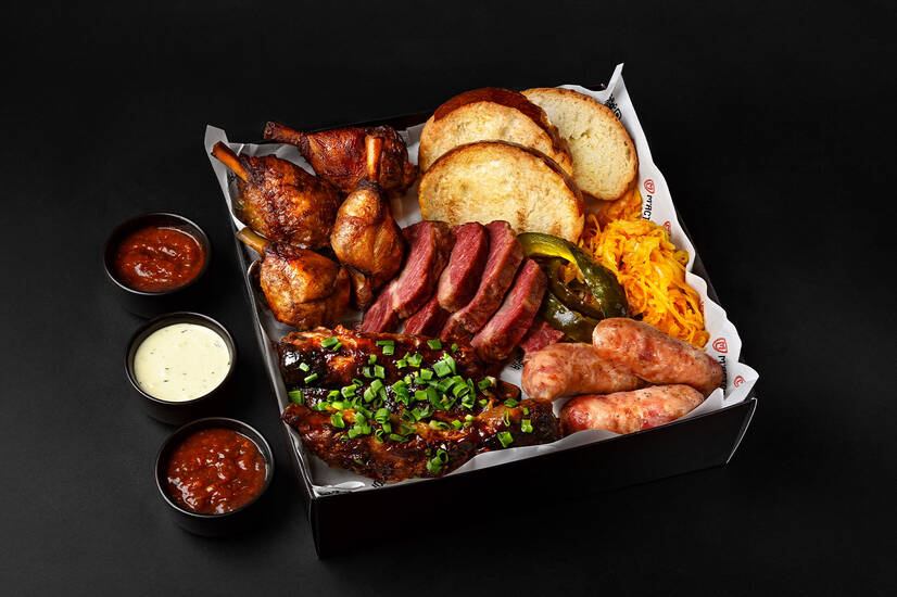 Ковбаски із зернами гірчиці, свинячі ребра BBQ, томлений яловичий бріскет з соусом Барбекю, курячі ніжки «Лолліпоп», капуста карі, огірок гірчичний, булочка Бріош, соуси До шашлику та Часниковий з тахіні.